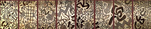 Discovering themselves to be on the rim of a circular chamber they moved toward the centre. No words were said. Each part of the savage design randomly picked up by the bouncing light of their torches and helmet-lamps gave out a silent roar. Soon they were in the centre of the smooth dry floor, their free arms each about the other's waist. Still without a word they were slowly turning like a paire of icedancers acknowledging the applause around a rink. They blocked no ray nor cast a shadow. All their light shone on the wall illuminating it in slow sequence. The wall, as they turned, ranged past them with its seamless parade of urgent dancing signs where volute met chevron, wheel pursued star and arrow chased arc. Nothing was regular: patterns that threatened to gather suddenly broke into scattered curves and dots, that in turn somehow reformed as striped and jagged waves to drive the rhythm on. Since their lights hit only the middle section of the savage cyclorama the markings tracked upwards and downwards, swallowed in the gloom like receding voices. The only purely literary element I borrowed was this last part of the description. I imitate the fading into darkness at the top and bottom of the drawing since it reminded me of that experience of discovery by illumination that I have had in caves and subterranean tombs. The drawing was not made in strict sequence: it leapfrogged toward it present size. The single sheet which innocently started the whole thing off becamse a pair of unlinked drawings. I put these up on the studio wall with a blank sheet between them. This I worked on to unite the three. This triptych did not wait long before a fourth independent drawing was produced. I put the last sheet of the three and this new drawing on the wall, interposed a blank, and repeated the procedure. Thus I now had a sequence of five. I then made a drawing which I considered to be a suitable end sheet for the extreme right. This in turn I set up with the last sheet of the five and two blanks between them. When these were finally completed in January 1992 I had the series of eight, which with some apprehension (having never seen them together), I got my assistant to put up along a wall of my other studio, half a mile away from where they were made. Rima's Wall, though a finite object as it stands, could self evidently be continued in any direction either in actuality or in the viewer's imagination. Thus in one sense it is a fragment that hints at a more compleate realisation of Collam's cave, an enclosing environmental version yet to be made. Work and Texts (1992), pp. 102-103. See also: Rima and El Greco |